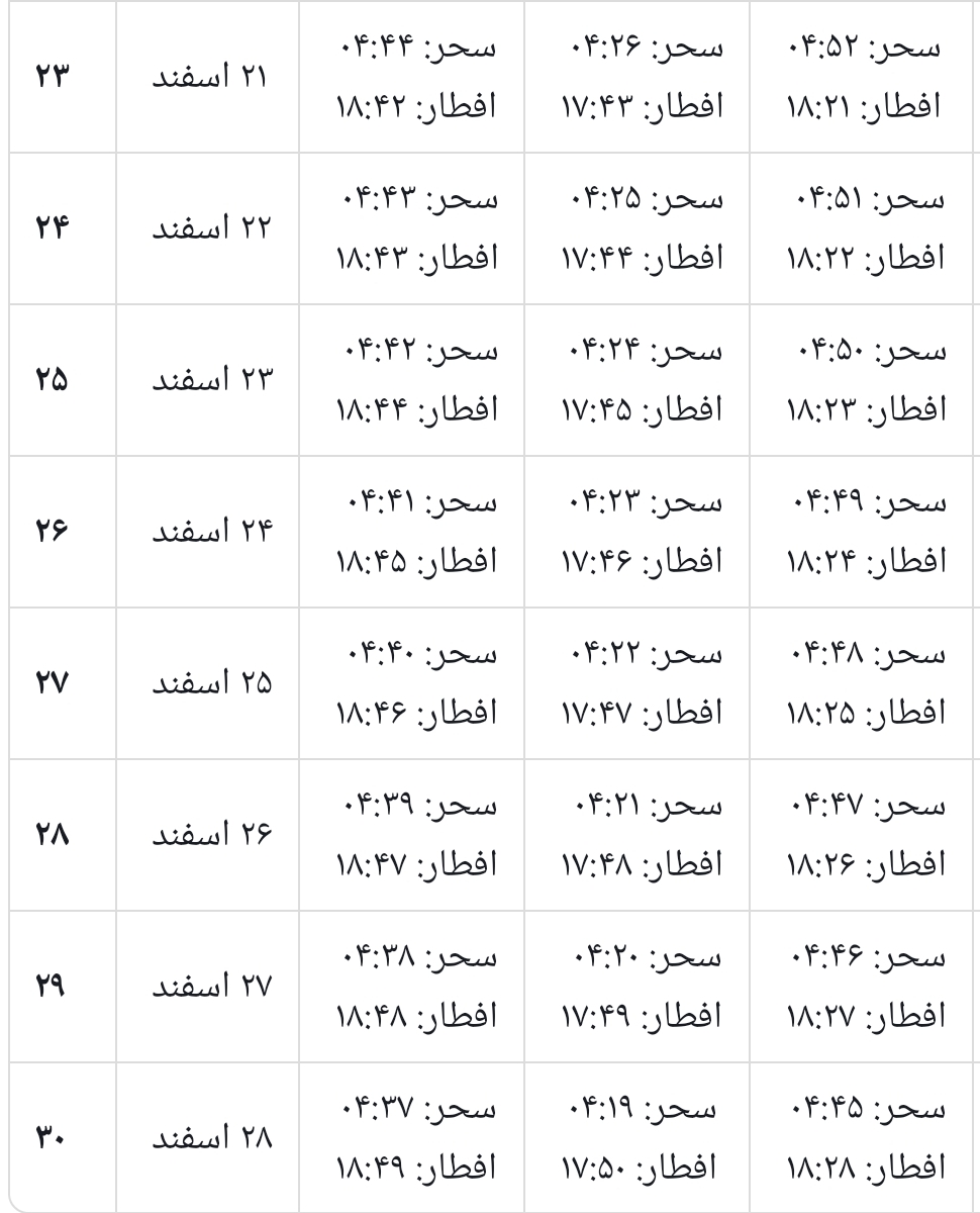 جدول اوقات شرعی ماه رمضان ۱۴۰۴ (۲۹ بهمن تا ۲۸ اسفند)
